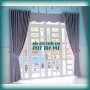 Rèm spa với voan trắng họa tiết mưa rơi và vải gấm màu xanh hoa văn nổi sọc.