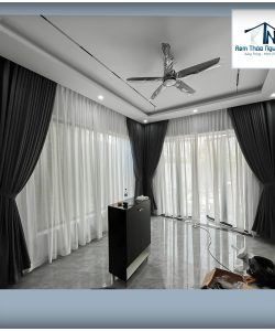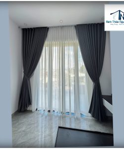 Rèm cửa hai lớp vải chính màu xám đậm hoa văn nổi kết hợp với voan trắng họa tiết tạo nên một sự kết hợp sang trọng và tinh tế cho không gian nhà biệt thự. Lớp vải chính dày dặn mang đến sự riêng tư và cản sáng hiệu quả, trong khi lớp voan mỏng nhẹ tạo thêm sự mềm mại và thoáng đãng. Họa tiết nổi trên vải chính tạo điểm nhấn thị giác, kết hợp với họa tiết trên voan tạo nên một tổng thể hài hòa và bắt mắt. Sự kết hợp màu sắc giữa xám đậm và trắng tạo nên sự tương phản tinh tế, mang đến một không gian vừa ấm cúng vừa thanh lịch.