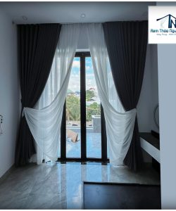 Rèm cửa 2 lớp vải chính màu xám đậm hoa văn nổi kết hợp với voan trắng họa tiết cho nhà biệt thự.