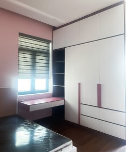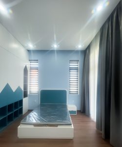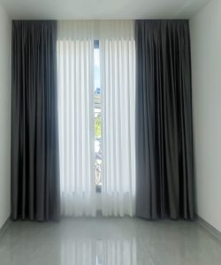 - Rèm 2 lớp: Vải bố xám kết hợp voan trắng giúp điều chỉnh ánh sáng dễ dàng, đảm bảo không gian nghỉ ngơi yên bình.