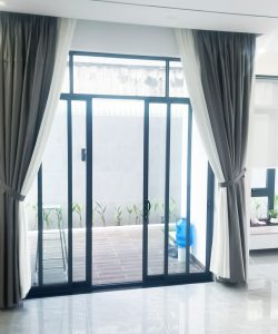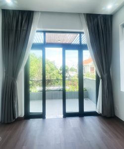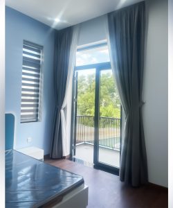 Hệ thống cửa ra vào hành lang và ban công phòng ngủ cũng được trang bị rèm 2 lớp đồng bộ, vừa đảm bảo sự riêng tư vừa tạo điểm nhấn thẩm mỹ hài hòa.