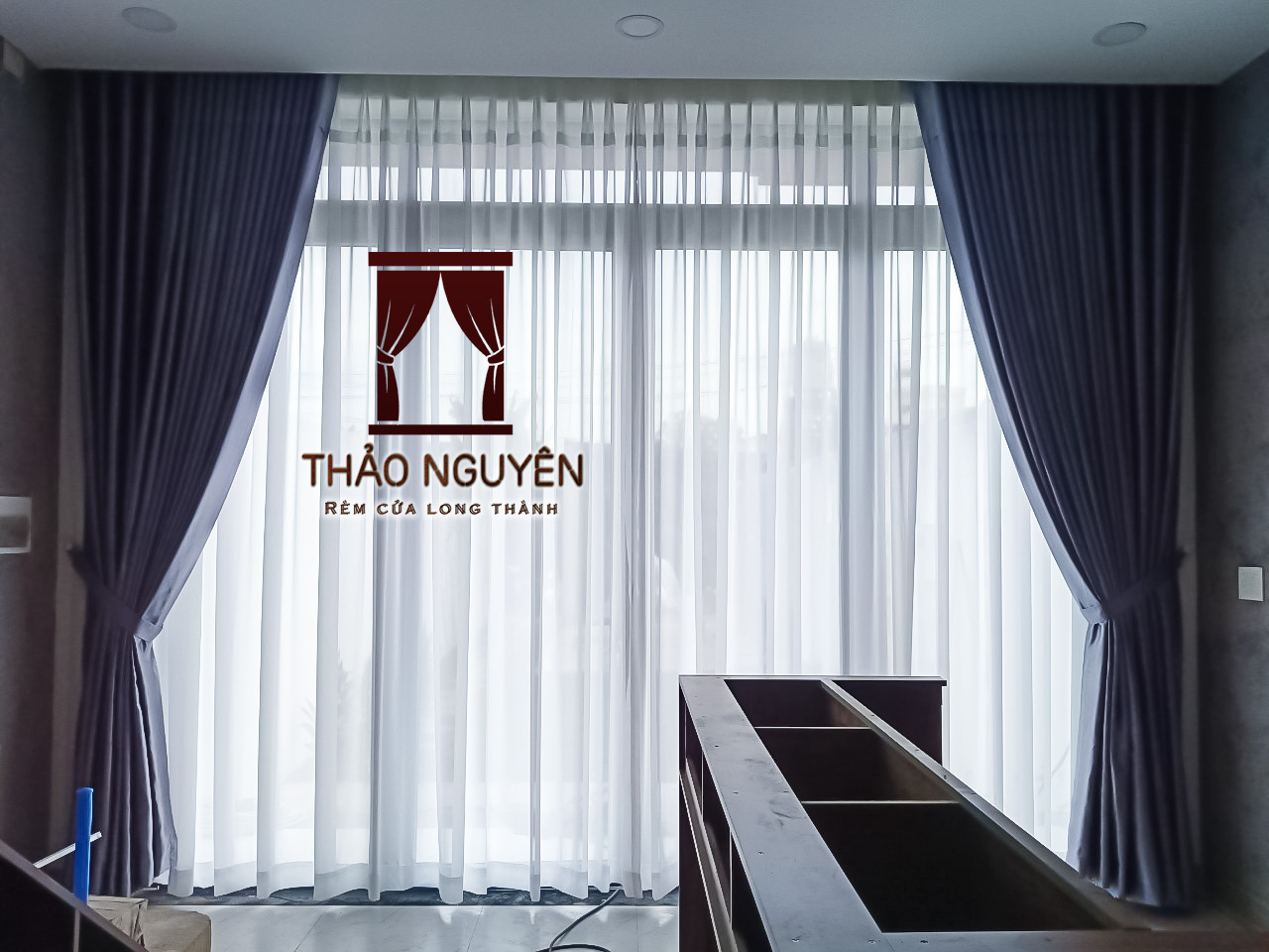 Công trình rèm vải 2 lớp, Rèm cửa tt. Long Thành Tp. Biên Hòa Đồng Nai, gồm rèm vải một màu hoa văn nổi và rèm voan trắng.