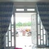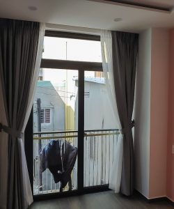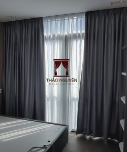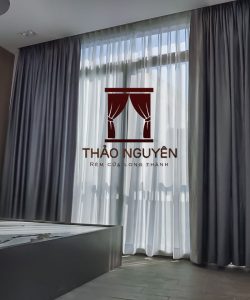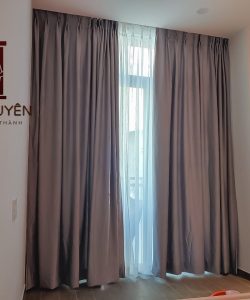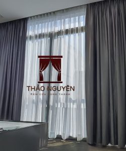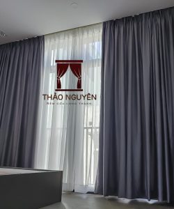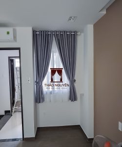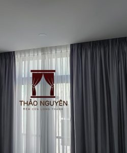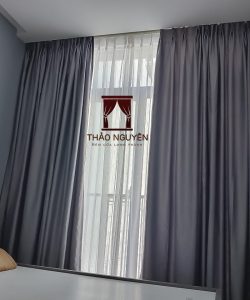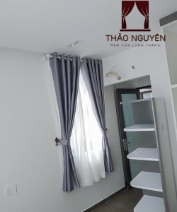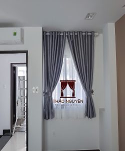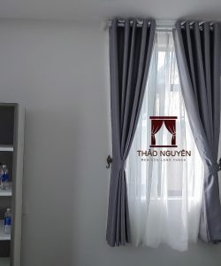 Công trình rèm nhà ở 2 lớp ở Long Thành Đồng Nai gồm rèm vải một màu hoa văn nổi và rèm voan trắng.