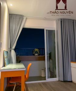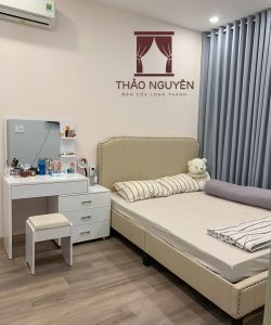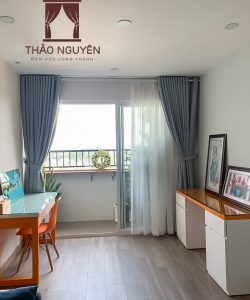Công trình rèm nhà ở 2 lớp ở Long Thành Đồng Nai gồm rèm vải một màu hoa văn nổi và rèm voan trắng.