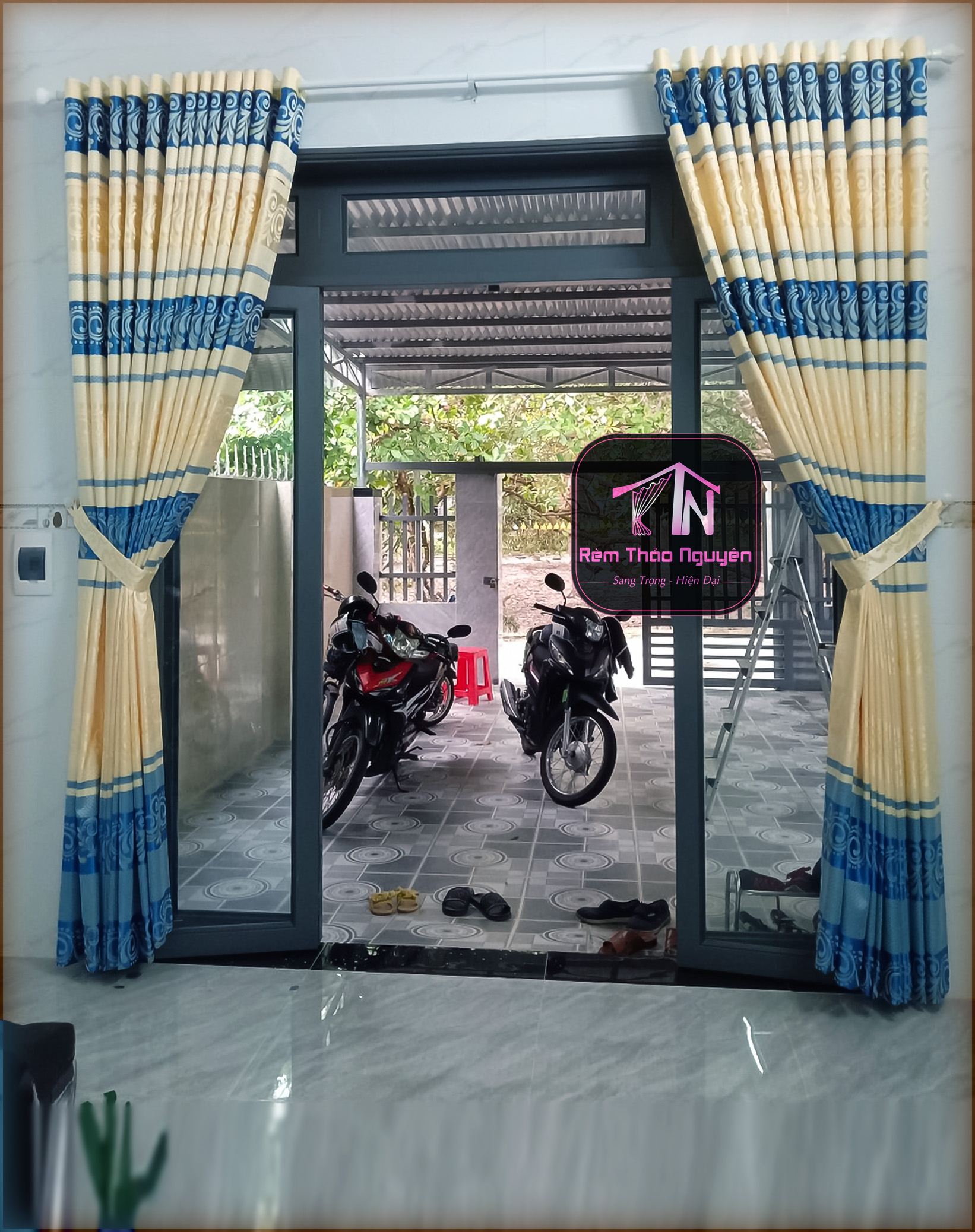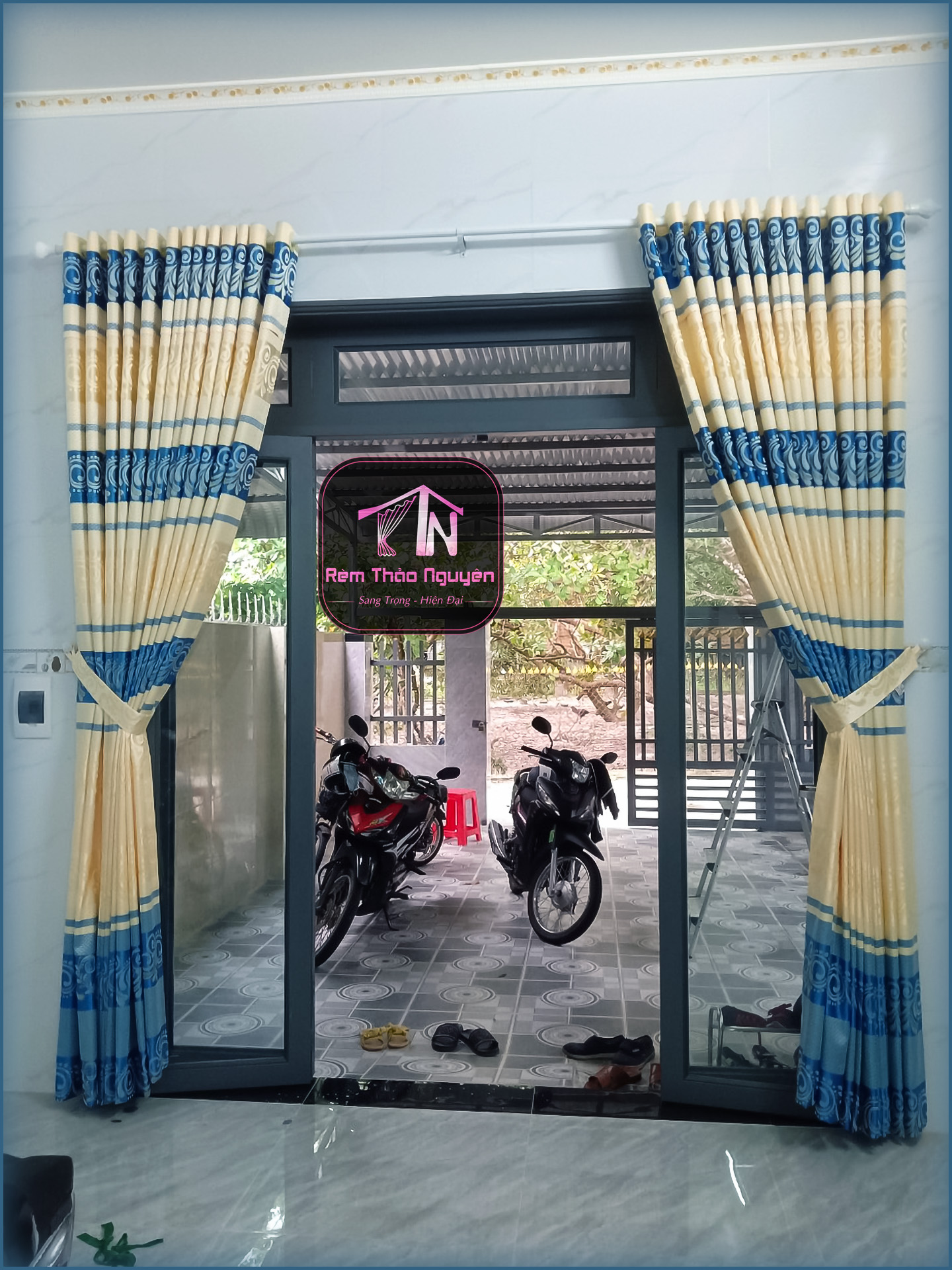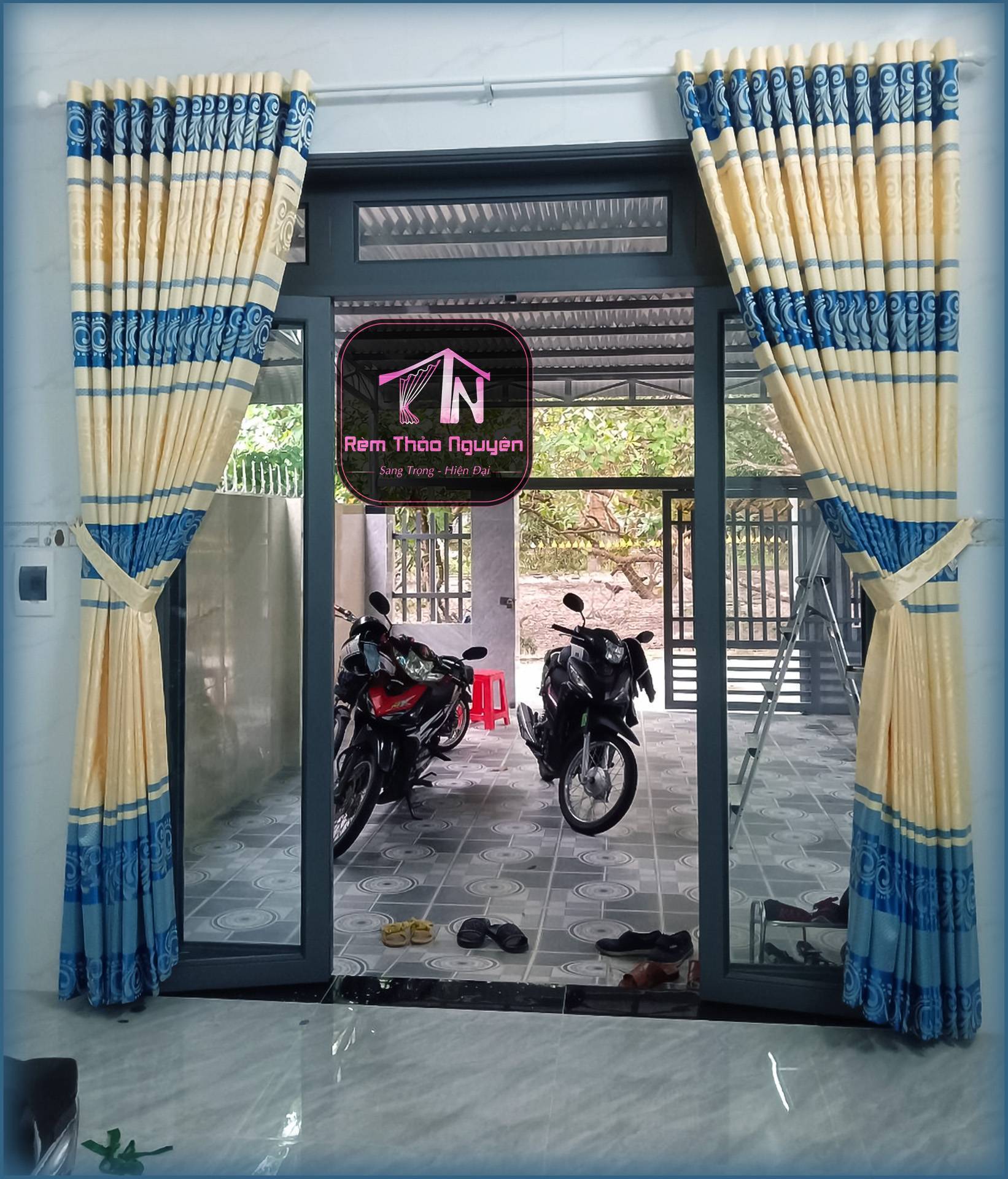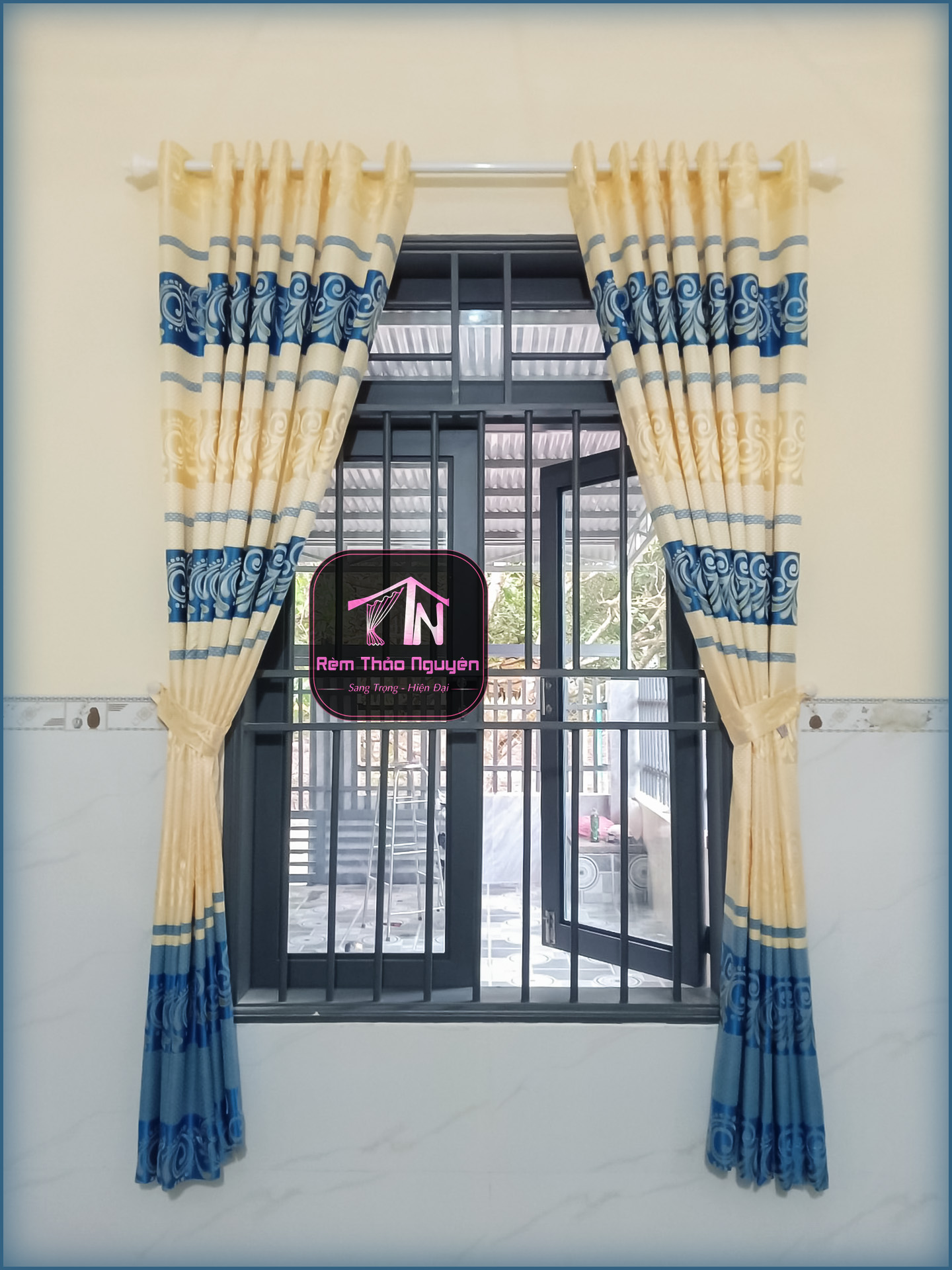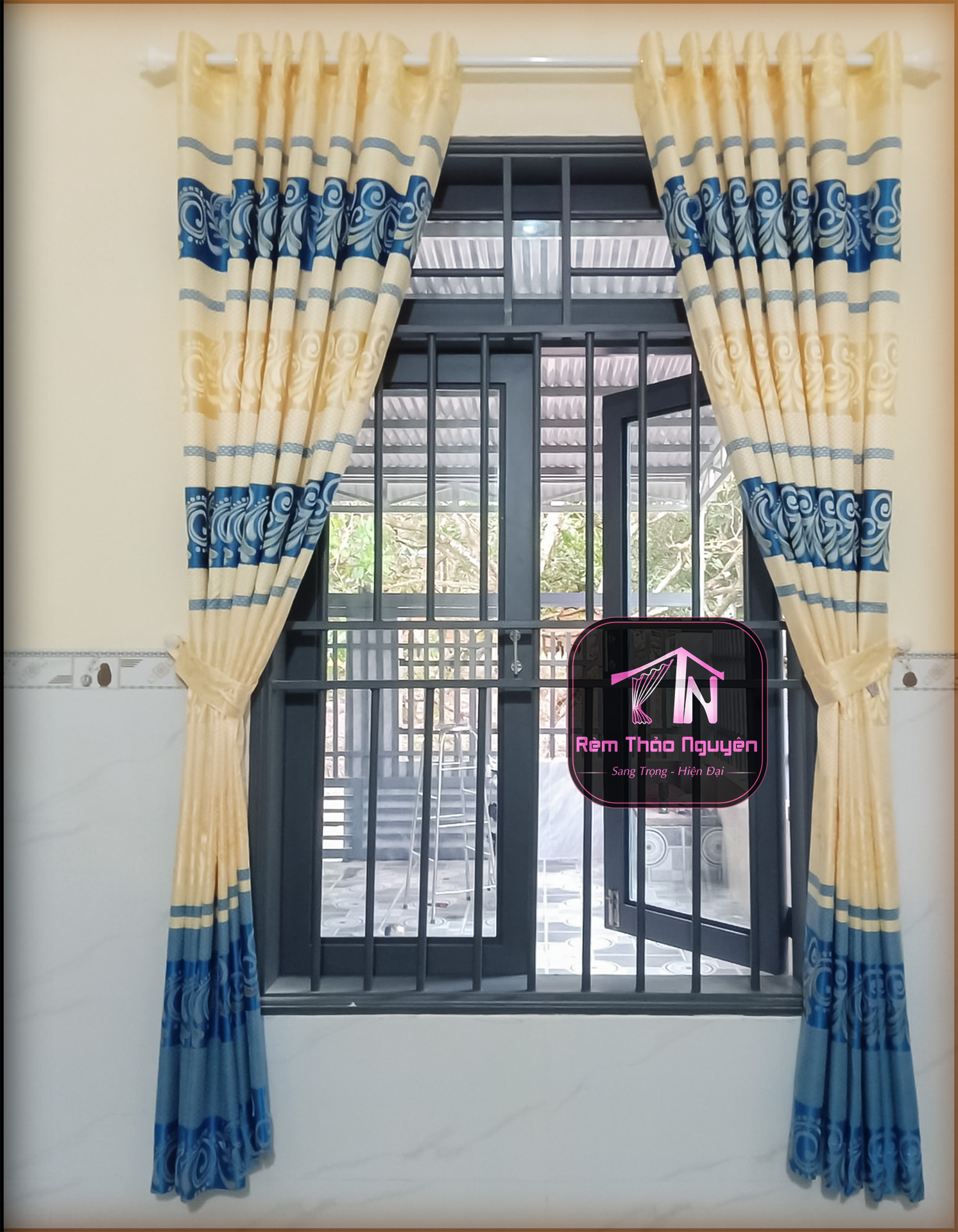 - Rèm vải gấm nhẹ nhàng có hoa văn.